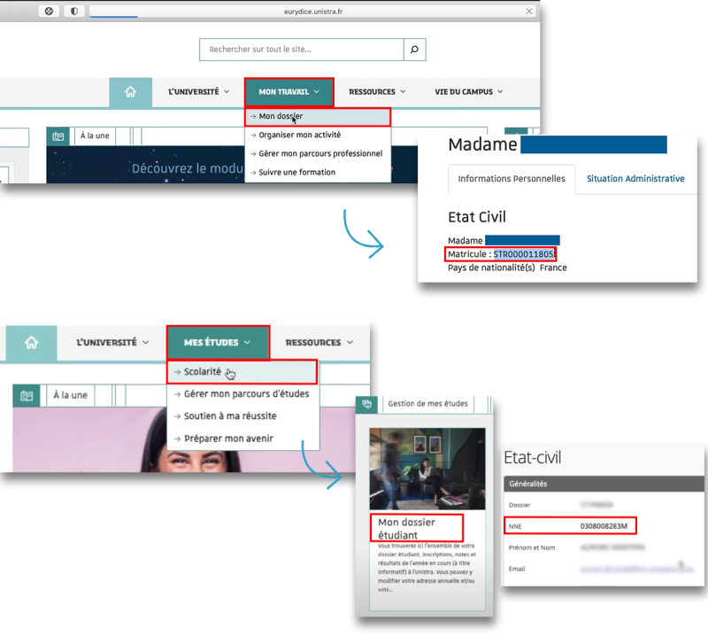 ➝ Etudiants : Mes études > Scolarité > Mon dossier étudiant (9 à 10 chiffres suivi de 1 à 2 lettres). https://youtu.be/7ozE0QphgeQ
